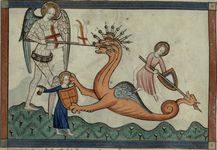 Here, we are told very little: a “battle in heaven,” “Michael and his angels.” What is at stake in this battle? There was a battle, and there is no longer any place for them in heaven. This is significant: heaven is the place of contemplation, and angels are naturally contemplative beings. And because of their sin of pride, they have lost their contemplation: there is no longer any place for them in heaven; Michael casts them down to earth.